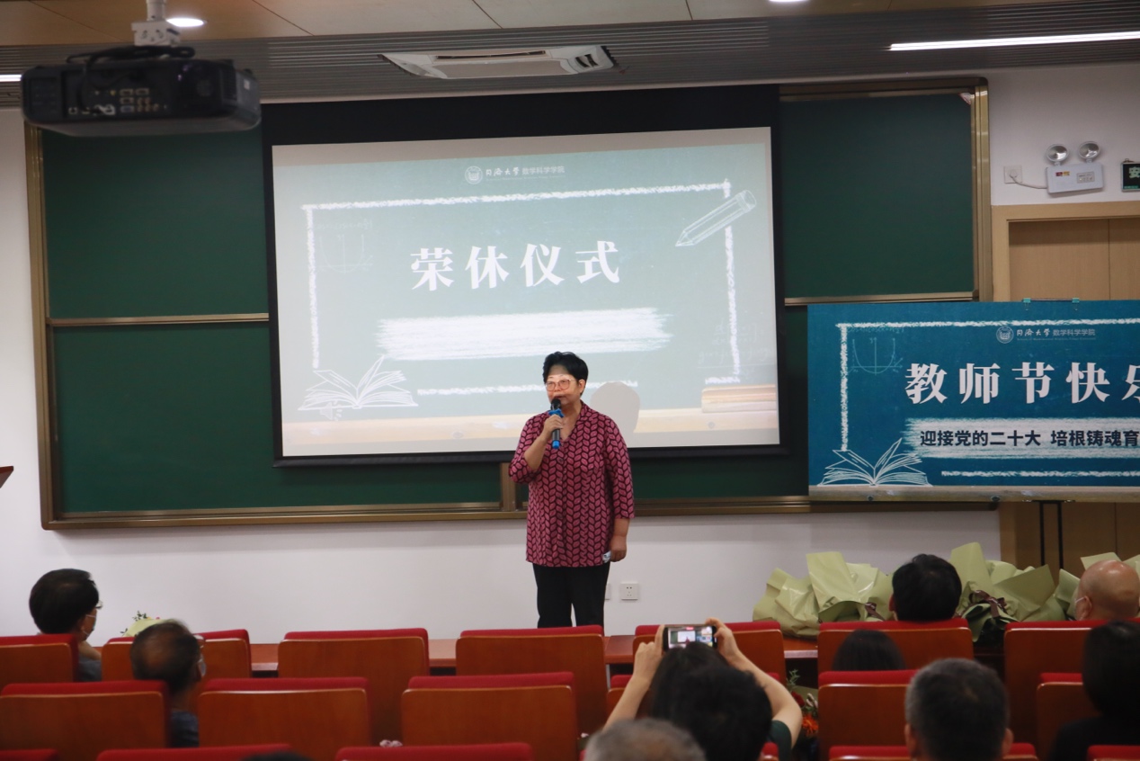 蒋老师代表荣休教师分享退休感言,分享自己从1983年入职同济大学至今,在不同的岗位和角度上见证着学院的发展和成长,表示自己对学院的感谢和自豪,退休后将一如既往关注学院,时刻准备发挥余热。