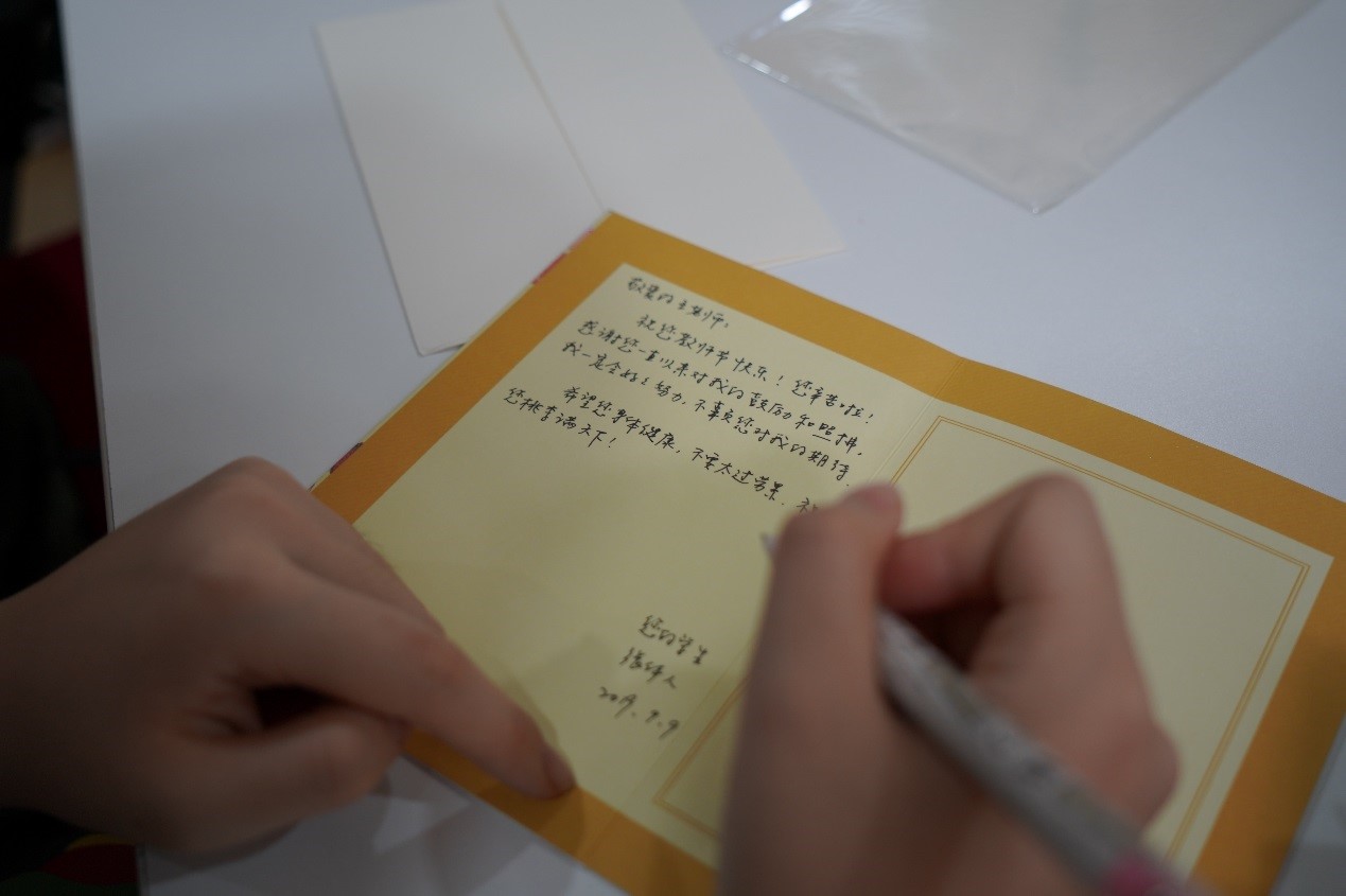 接着同学们将各自对于老师的祝福和自己的期盼写在贺卡上。在贺卡上有的同学这样写道:“教师节快乐!很开心也很幸运研究生能有您的指导与帮助,感谢您的悉心教导,您辛苦了。祝您身体健康,万事顺意!”;也有的同学这样写道:“祝您教师节快乐!您辛苦啦!感谢您一直以来对我的鼓励和照料。我一定会好好努力,不辜负您对我的期望。希望您身体健康,不要太过劳累。祝您桃李满天下”。