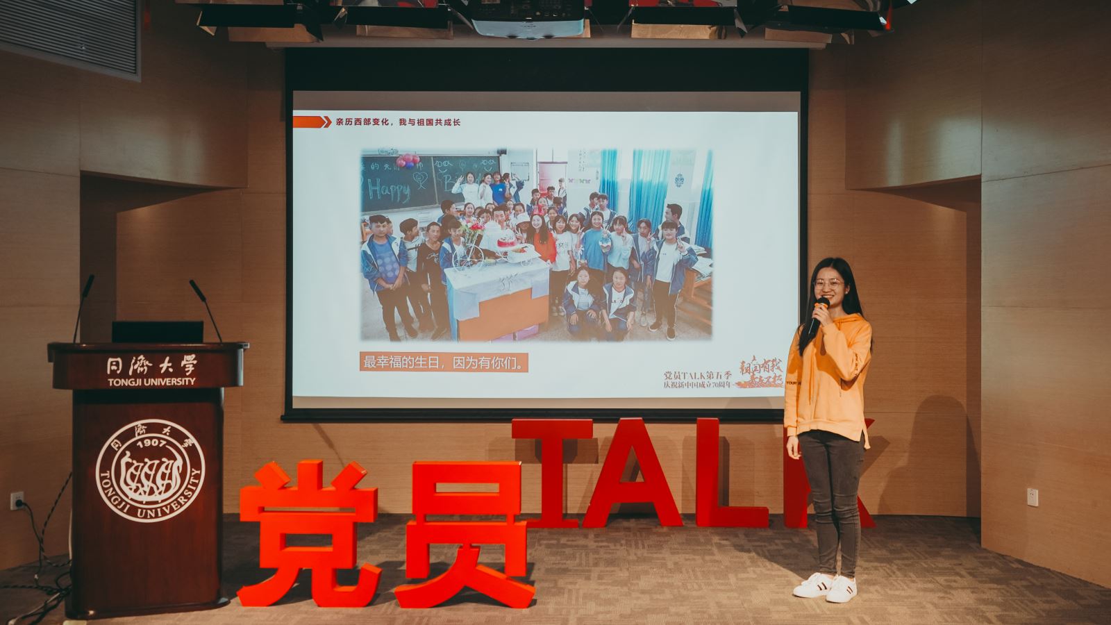 最后一位讲者薛元圆同学,她生长在西部,见证了家乡的发展,本科毕业后怀着一颗感恩的心,响应“到西部去,到基层去,到祖国最需要的地方去”的号召,成为一名西部计划志愿者,前往云南支教一年。她讲述了自己支教期间的故事和感动,她是西部发展的亲历者,切身感受到在国家实施教育均衡、教育扶贫等政策下,农村的教育硬件有了很大的改善。作为支教团成员的一名,她分享了同济人接续为西部发展的故事。她呼吁大家,以青春之名,扛起时代重任,关心祖国的发展,为祖国发展贡献自己的力量。
