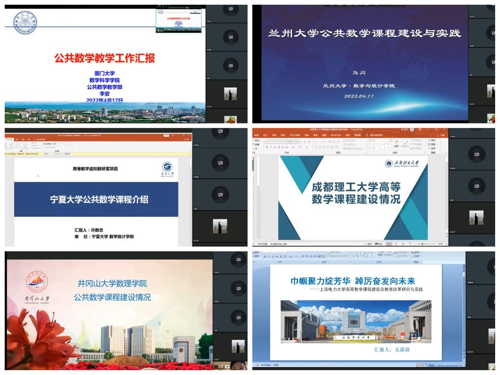 按照会议议程的安排,七个成员高校分别介绍了各自在高等数学等公共数学教学建设的情况。同济大学作了题为“高等数学一流课程建设与实践”、厦门大学作了题为“公共数学教学工作汇报”、上海电力大学作了题为“巾帼聚力绽芳华 踔厉奋发向未来”的报告等。会上分享了同济大学在课程建设和教材建设、厦门大学在数学竞赛和青年教师培养、兰州大学在课程设置和教师培训、宁夏大学在教学评价和疫情期间线上教学、成都理工大学在团队建设和课程思政、井冈山大学在课程建设和青年教师培养、上海电力大学在作业系统和教学评价等方面的成功经验。