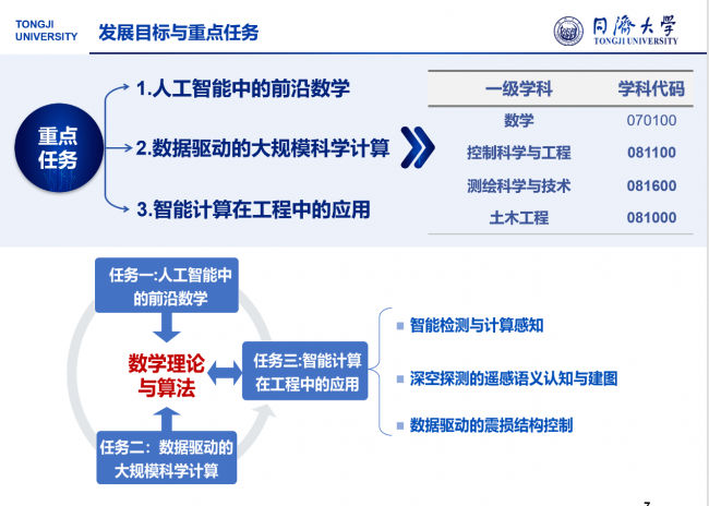 建设,主要围绕三大科学问题进行布局:人工智能中的前沿数学,数据驱动的大规模科学计算,智能计算在工程中的应用。重点实验室充分发挥同济大学数学学科的深厚积累及在科学计算方面的优势,结合同济大学深厚的工科传统,大力推行学科交叉、国际合作交流、高端人才引培和专职科研队伍建设,面向国际科技前沿和国家战略需求,深入研究人工智能的基础数学理论、算法及其工程应用,为国家人工智能发展战略的顺利推进保驾护航。