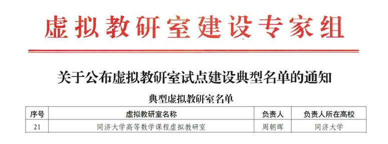 周朝晖教授牵头建设的“同济大学高等数学课程虚拟教研室”入选典型虚拟教研室。