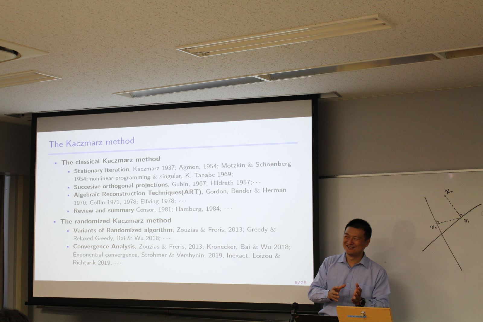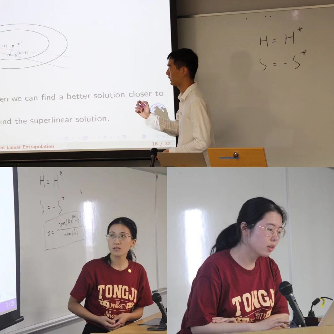 为了提高算法的计算效率,曾我部知宏副教授和殷俊锋教授分别做了题为“K-tridiagonal matrices with application”和“On randomized Kaczmarz method for solving large sparse linear systems”的报告,从K三对角矩阵的快速算法的理论及其应用、随机Kaczmarz算法的历史研究和最新进展方面做了丰富全面的介绍,吸引了参加论坛老师和研究生的广泛讨论。
