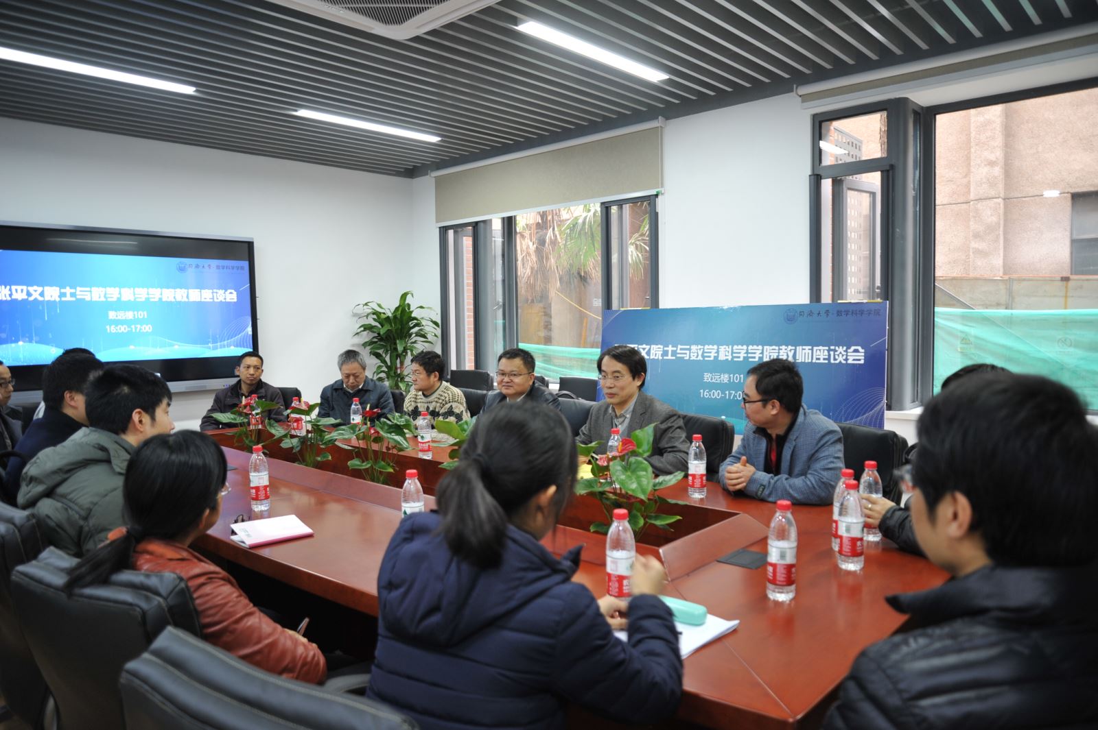 会后,张平文院士还与学院教师开展了学术座谈。我院国家杰出青年基金获得者许学军教授、芮和兵教授,优秀青年科学基金获得者付强教授、李平教授, 姜立建教授等出席了座谈会。张院士与青年教师交流了学习和研究应用数学的方法,分享了个人对偏微分方程研究的看法,探讨了对横向项目申请的建议;他还介绍了北大在培养青年教师的成功经验,鼓励青年教师要对数学研究有信心,告诫大家在做学问、学术合作方面均要认真对待,同时还提醒青年教师要多和本科生接触,掌握本科生的学习状况,可以看出张平文院士对青年教师寄予的深切期望与无限关怀。