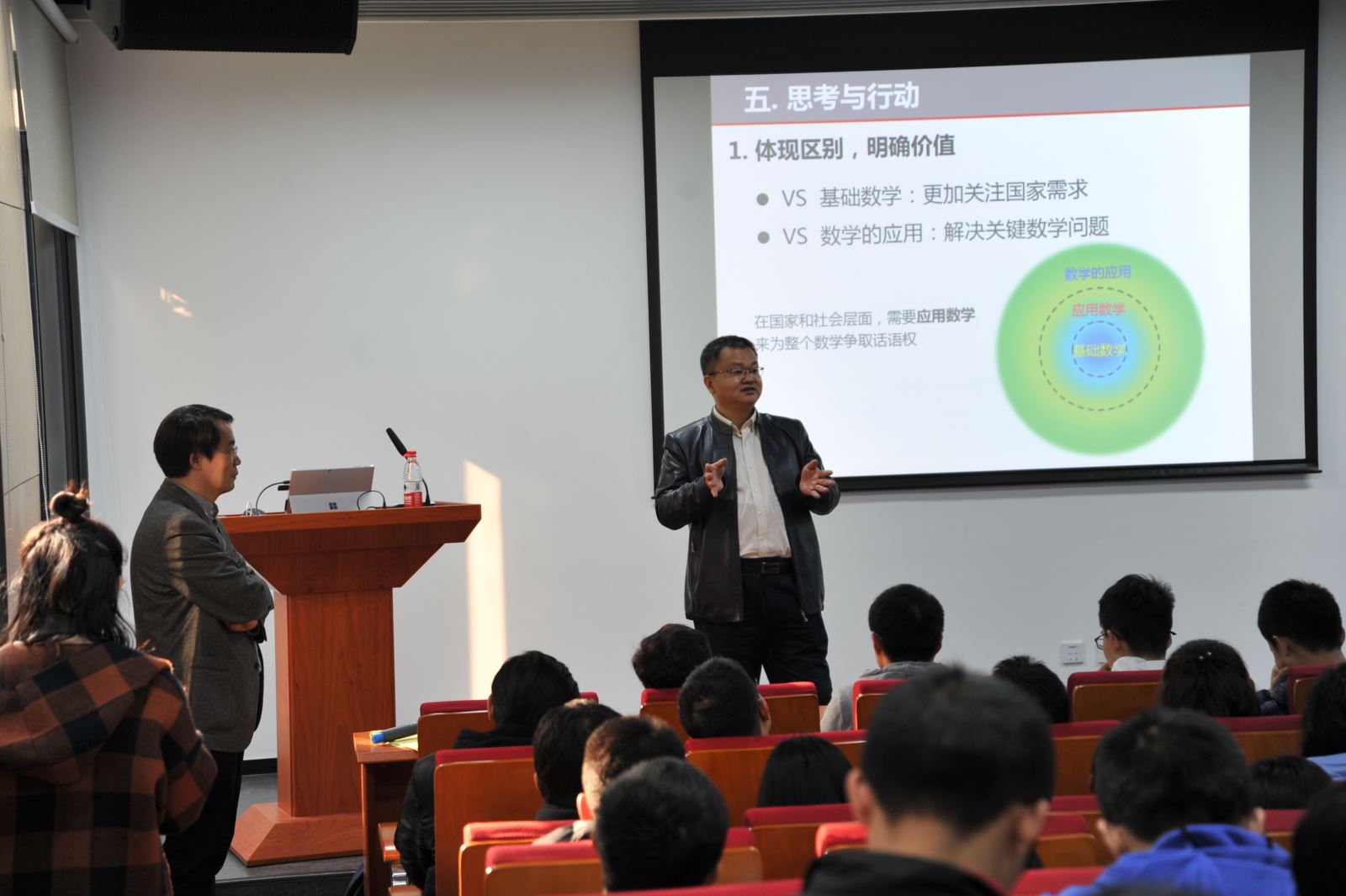 首先,张平文院士结合自身经历从应用数学的发展历程、我国当前应用数学的发展水平、应用数学与基础数学的基本价值观的异同、应用数学的学科分类以及研究重点变化等方面进行了详细生动的讲解。随后,张院士介绍了与大数据相关的基本概念,指出我国计算能力在计算硬件和模型的上的优势以及计算软件的不足,介绍了大数据的内涵—即核心内容为思维方式的改变。接着,张院士介绍了大数据未来发展趋势、给我们带来的影响以及人工智能、大数据和计算能力三者之间的关系,并且总结阐述了大数据对应用数学将来的挑战和机遇。最后,张院士勉励同学们在研究数学时需要坚守情怀、不忘初心,坚持正确的价值观。