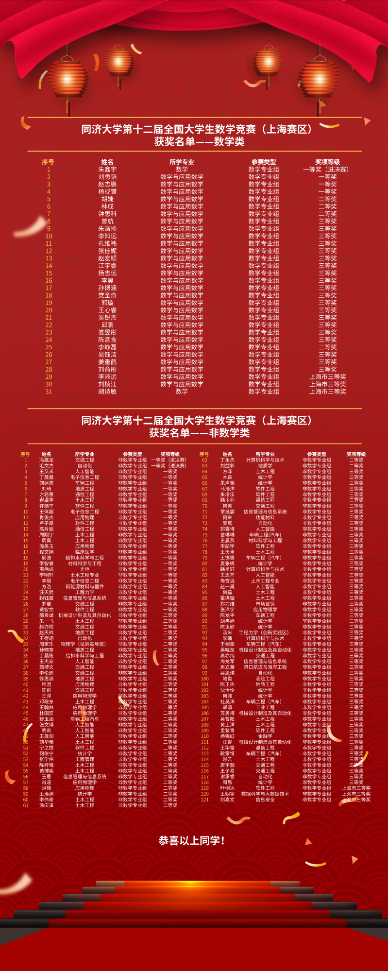 非数学专业组竞赛中,我校获得27项全国一等奖,其中冯嘉龙(交通工程)、毛文杰(自动化)两位同学闯入全国决赛,一等奖人数较上一年度翻了一番;同时我校学子还获得36项全国二等奖、55项全国三等奖、3项上海市三等奖,获奖比例高达59%。