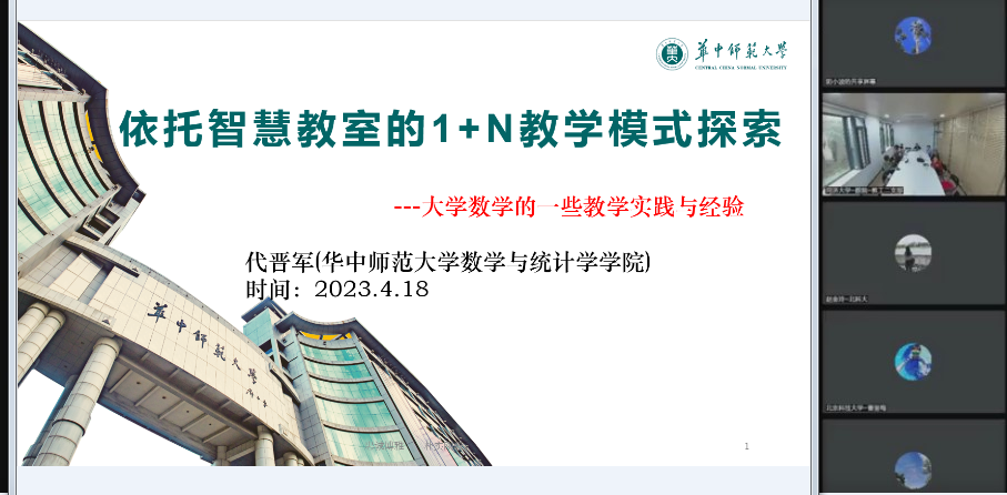 华中师范大学数学与统计学学院代晋军副教授以 “依托智慧教室的1+N教学模式的实践与探索”为题做报告。代老师详细介绍了1+N教学模式的课前、课中、课后教学活动开展方式,分层综合练习设计,高等数学图形系统建设等,并以傅里叶级数收敛定理、二重积分计算、复杂空间曲线绘制为例,讲解了将教学内容数字化、可视化、直观化的教学设计。