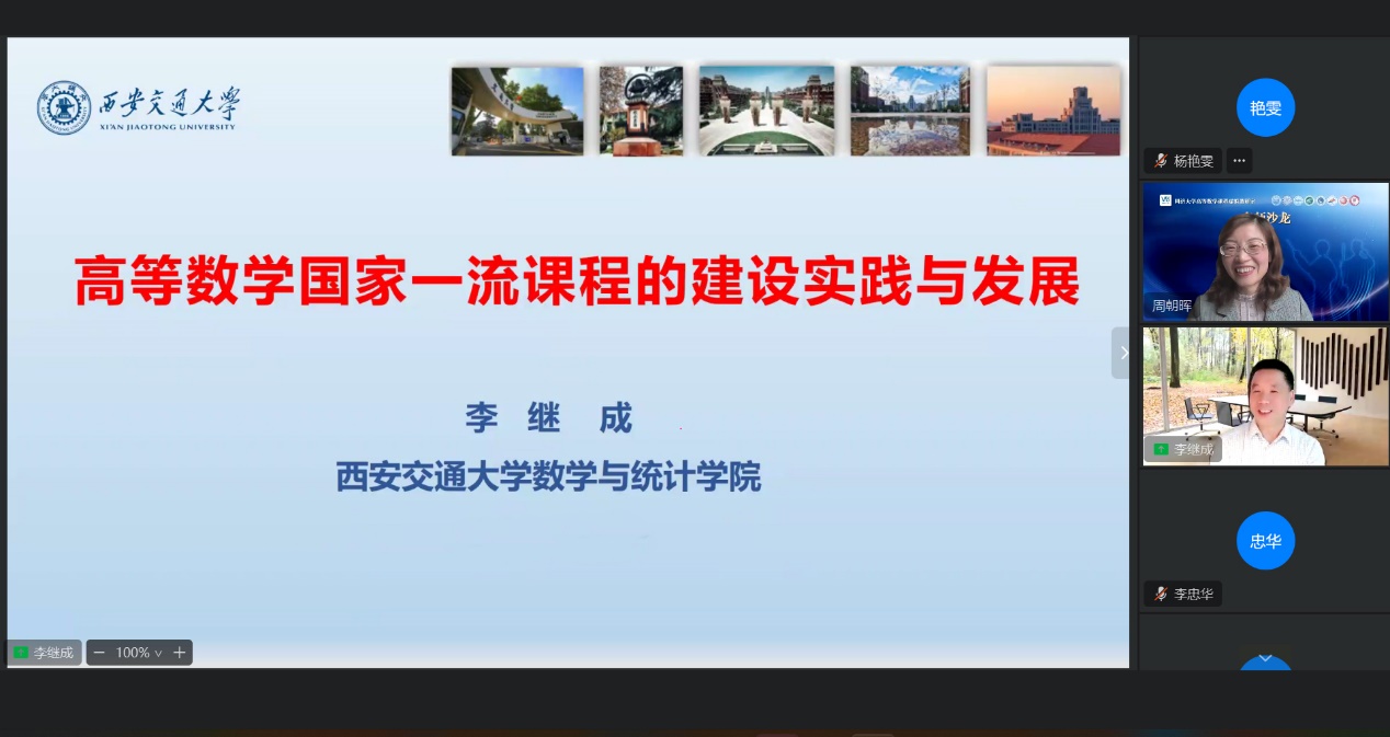 最后,李继成教授与参会老师展开了热烈讨论与交流,对如何在理论数学教学中同步穿插数学实验教学,如何将前沿科学问题融入数学教学内容等问题进行了解答,针对建设“厚基础、重实践、高阶性、创新性、挑战性”特色的高等数学国家一流课程提出了诸多有益建议。