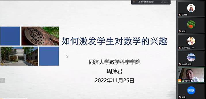 同济大学周羚君副教授作了题为“如何激发学生对数学的兴趣”的报告。他分享了自己在数学课程中挖掘到的思政元素:培养学生小心求证、敢于质疑的科学精神;培养学生严谨、实事求是的科学作风;培养学生认识科学规律的一般过程;数学定理和例子中的哲学元素,并表示,培养学生的学习兴趣是基础。周羚君结合实际教学总结了三类能够提升学生兴趣的教学案例。第一类是结果出乎直观、有震撼力的案例,即在课堂上选用直观认知和最终结论相反的案例,激发学生好奇心;第二类是通过比喻类比、化难为易的案例,在教学中采用比喻类比的方法,帮助学生在短时间内掌握抽象难懂的概念或定理;第三类是能联系多门课程、小问题大道理,引导学生建立不同课程之间的联系,加深对知识的理解,发现数学之美。