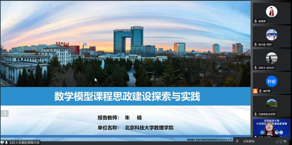 北京科技大学朱婧教授以“数学模型课程思政建设探索与实践”为题作报告。她表示,数学课程教学而不仅仅要传授课程知识、培养数学素养、数学能力,还要帮助学生树立正确的价值观与人生观,要构建师生学习共同体,通过传递知识、能力培养,实现价值引领。朱婧教授从“更新教学理念 调整教学目标”、“重构教学内容 创新教学体系”、“挖掘思政元素 做好教学设计”、“与信息技术有机融合 创新教学手段”、“课程思政效果评价”五个方面介绍了开展课程思政的做法,并分享了具体案例。