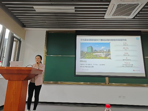 张丽娜老师介绍了华为上海研究所的基本情况。华为作为全球领先的ICT基础设施和智能终端提供商,以构建万物互联的智能世界为愿景,聚焦ICT技术,面向三类客户,提供产品、解决方案和服务。张老师还告知了同学们华为暑期实习及秋招的各类时间节点,提醒同学们提前做好相关准备。