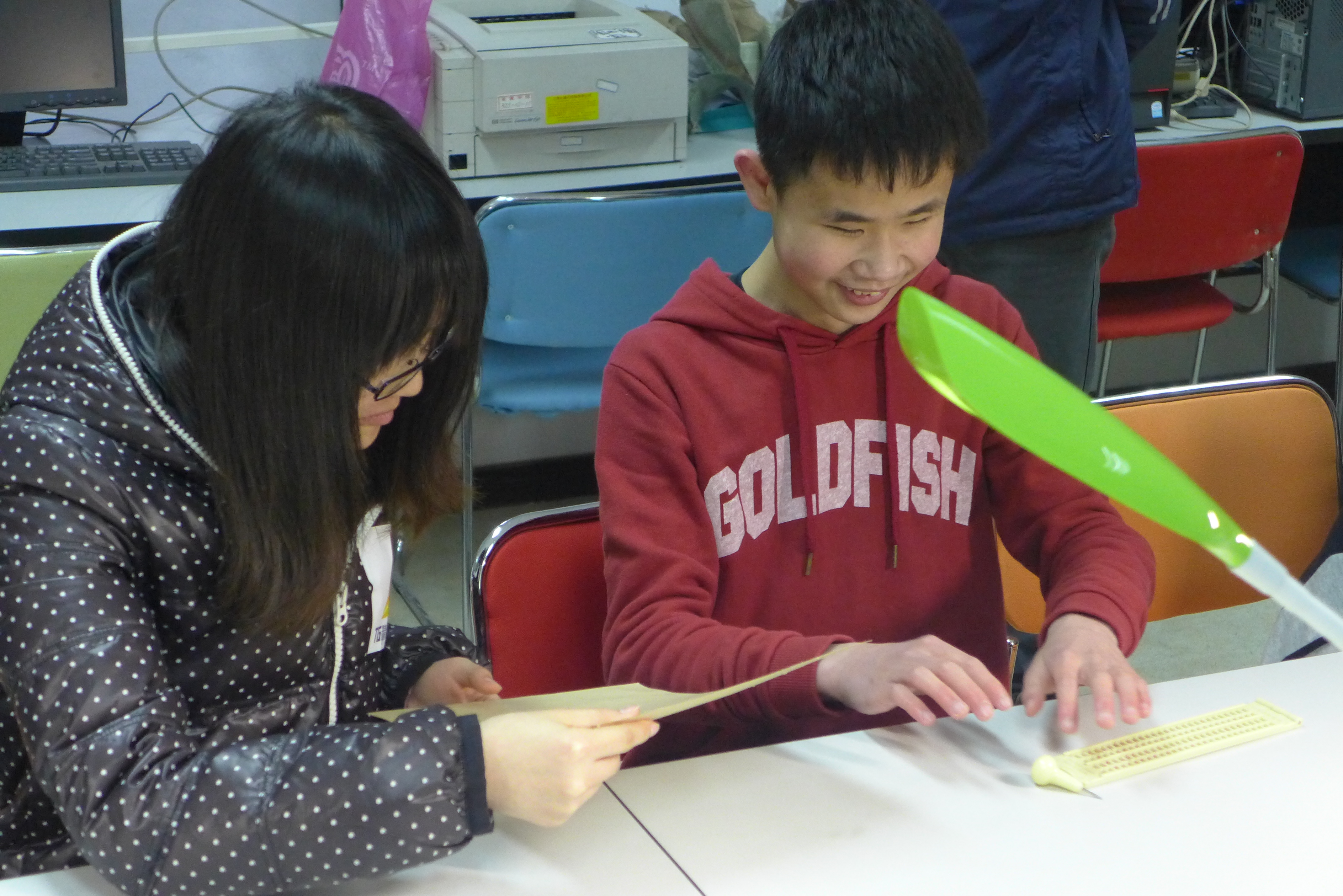 参观结束后,盲童们在盲文纸上书写盲文,为大学生们写了一段祝福的话,大学生们都非常开心。在短短三刻钟的交流交流过程中,大家都从一开始的拘束与紧张,慢慢互相熟悉,互相了解,从各自的年龄与姓名,到各自的爱好与以后想做的事,大家互相了解,短短的三刻钟在欢声与笑语中度过。也许在他们的记忆力,我们只是过客匆匆,以后可能也不会记得曾经有几名同济数学的大学生来到这里,与他们共享片刻的欢乐,但是在我们心里,我想我们会记得他们的纯真笑脸,他们懂得珍惜生活,每一丝风,每一丝芬芳,都会在他们感受中留有余迹。生活中那些我们不在意的点滴,在他们心中都是五颜六色,他们的感受真诚,他们的笑容也不会打折。