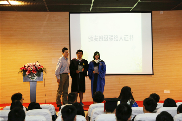李少华教授将班级联络人聘书颁发给了李杨帆同学和刘锦河同学,以期待他们能架起校友与母校之间联络的桥梁。