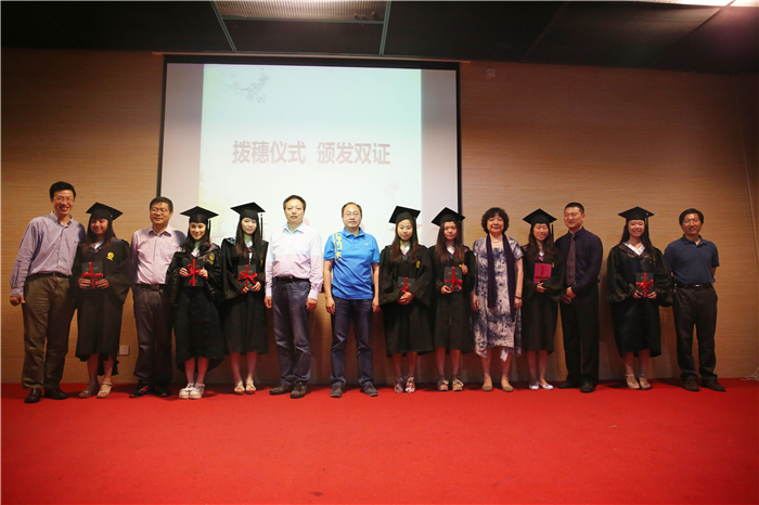接着就是最为惊动人心的拨穗及颁发证书的仪式了。同学们依次上台,从帮助自己成长的教授手中接过毕业证书和学位证书,同时,教授们为同学们一一拨穗,献上最好的祝福,并与同学们合影留念。