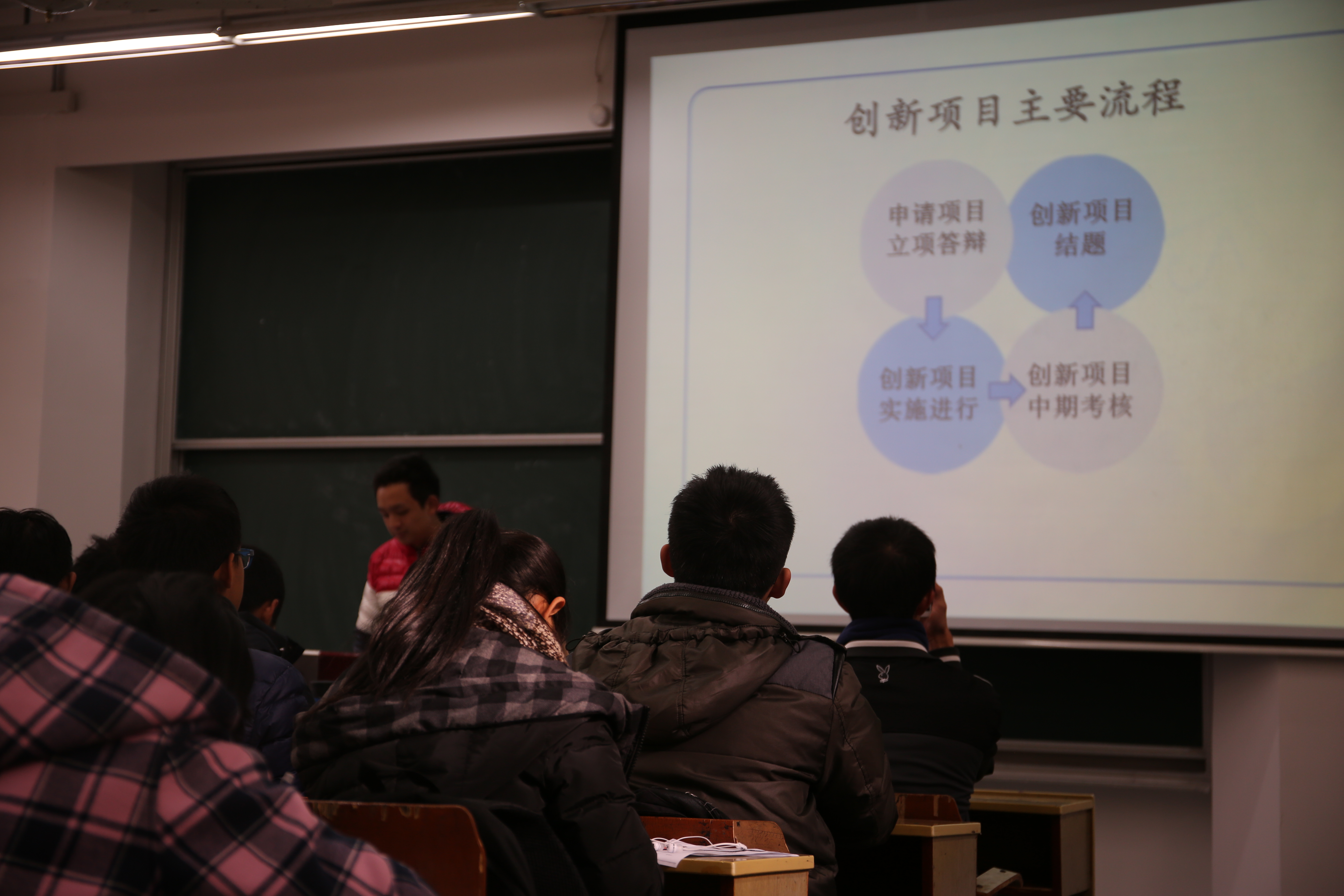 宣讲会的第一部分,主讲人赵凌乔同学为大家介绍了创新项目的具体流程和申请创新项目的四大平台,讲解了在申报创新项目时可能会遇到的相关问题。