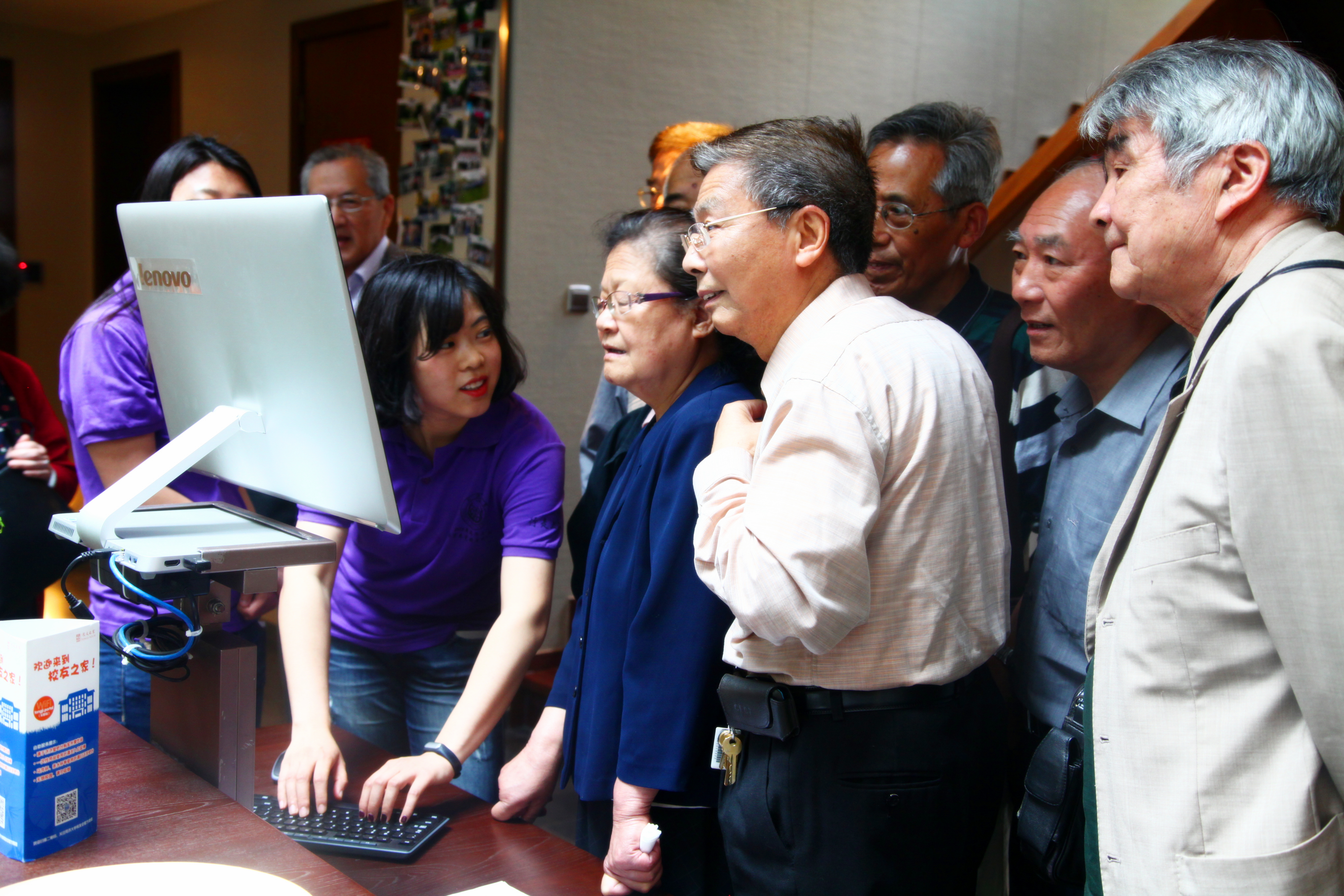 当日上午,校友们在志愿者的引导下参观了校友之家—旭日楼,并在校史馆重温了母校的百年历史。在校友之家,校友们寻找当年入学时的照片,看着照片上的青春面孔,两鬓已经斑白的校友们不禁感慨时间的匆匆,说起了当年在同济读书期间的种种难忘经历。校友们提议登高看看同济,在了解校友们的意愿后,志愿者随即与图书馆工作人员联系参观事宜。据校友回忆:当年校友们也为同济大学图书馆的建成出过一份力,但遗憾的是65届校友直到毕业也没有真正在图书馆学习过。图书馆有关工作人员热切地欢迎了校友们,并安排了讲解老师。在讲解老师的带领下,校友们在十楼的闻学堂俯瞰同济全景,凭着过去的回忆在校园内寻找自己当年学习生活的地方,重温了那段青春岁月。