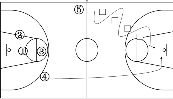 男生5号在位置⑤接球,运球穿过障碍物(凳子),以打板或是空抛的方式将球传给顺下的男生4号,男生4号的投篮必须在空中完成。若投篮未进,男生4号须自行将球打板后补进。