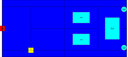 3、 每队选出一名同学负责抛球,中途不允许更换。每次一位负责击球的同学站在红色区域,负责抛球的同学站在黄色区域。两人配合把球打到指定的区域内获得相应分数,每人有八个球的机会。要求球必须一跳后击打,不允许两跳。没有打到指定区域或者下网均为零分。准备好后与裁判员示意开始这一分,等裁判员示意记分好后开始下一分。每名同学结束后签名表示认可分数。(见图1)