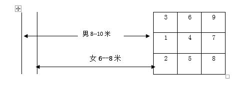 3. 场地设置:起掷点距落地区8-10米(女生6-8米),落地区为长方形方格,方格内分9个区域,每个区域长、宽均为1米。(见上图)