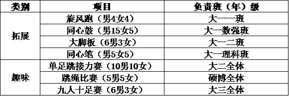 个人报名方式:请同学们选择自己感兴趣的项目于4月28日下午15:00点之前编辑短信“类别+项目+姓名+性别+学号+班级+联系方式”到15901613057(刘同学处)即可,注意:每位同学最多可报两个项目。
