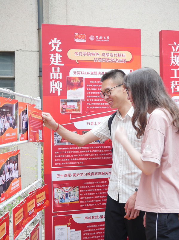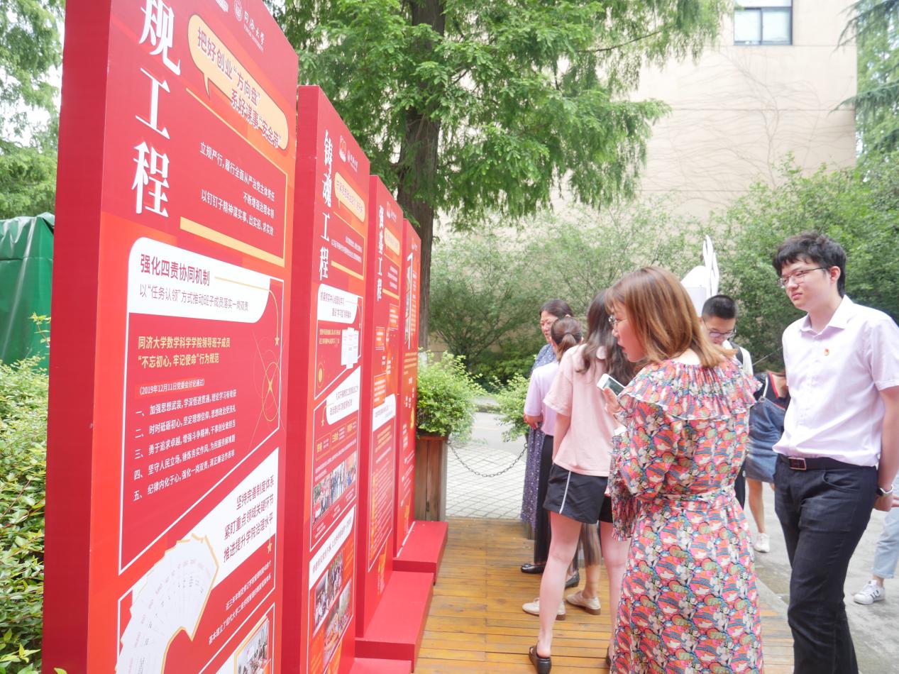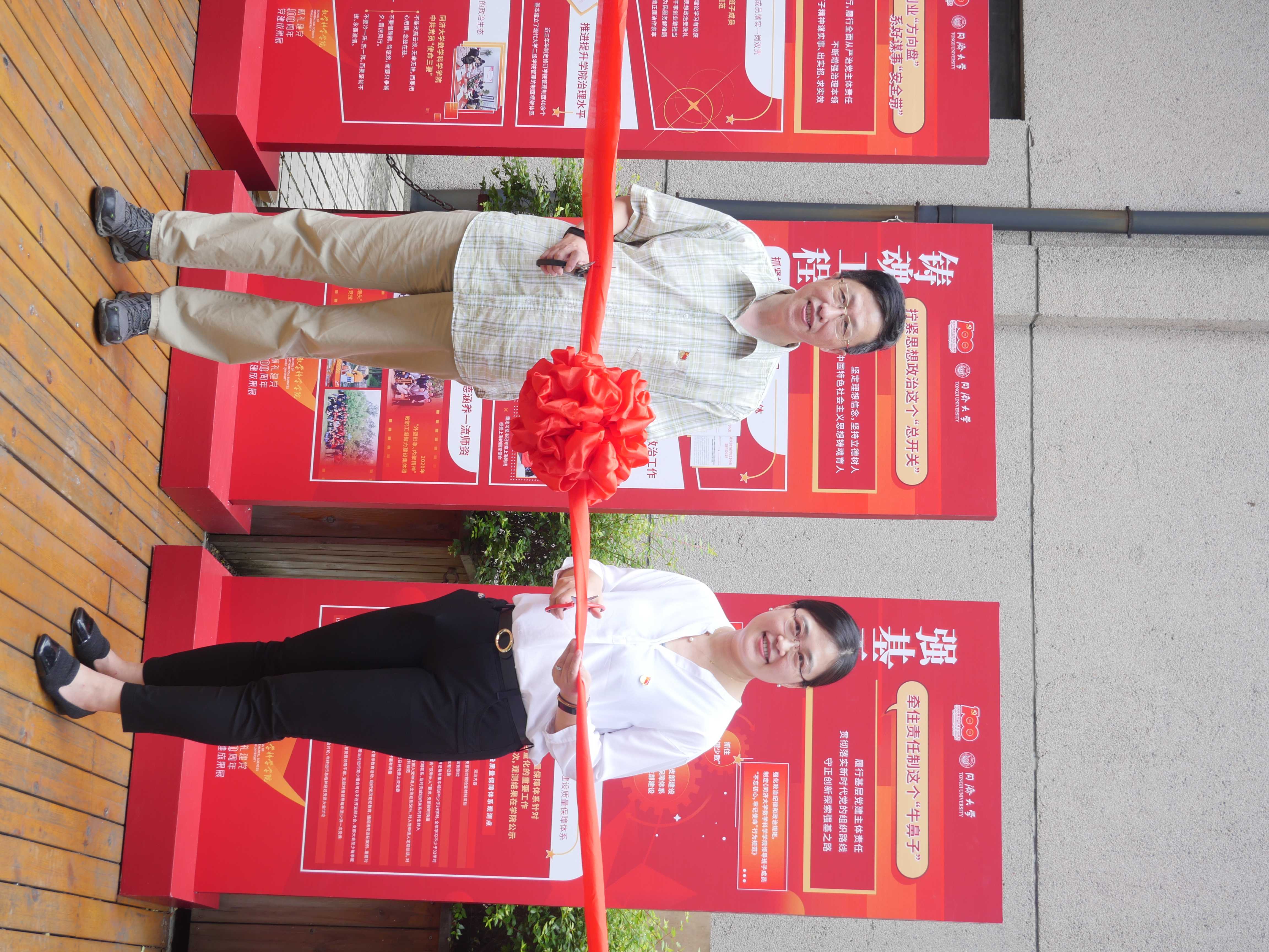 李静茹与李少华两位老师代表师生党员为欧洲足球比分直播 党建成果展开幕剪彩。欧洲足球比分直播 师生党员积极观展,并在打卡展板处合影留念。